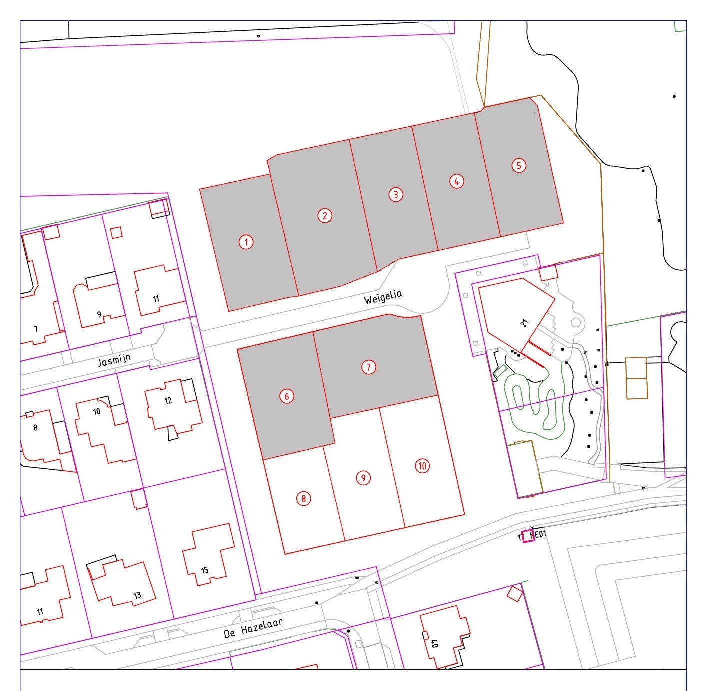 Op basis van de ambities en de uitgangspunten die voortvloeien uit de analyse van het plangebied is een stedenbouwkundige verkaveling opgesteld. Het plan gaat uit van 10 vrijstaande woningen/kavels. Hierbij is de bestaande stedenbouwkundige structuur en woningtypologie van de Jasmijn en de Hazelaar doorgetrokken. De groene omlijsting van het gebied wordt behouden, wel wordt de wal tussen de bestaande- en nieuwe woningen met enkele meters versmald. Dit doet echter geen afbreuk aan het groene karakter en zorgt ervoor dat er meer verbinding ontstaat tussen het oude en nieuwe gedeelte van de straten.