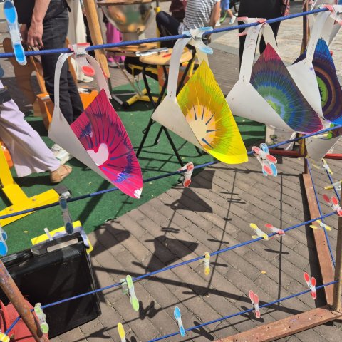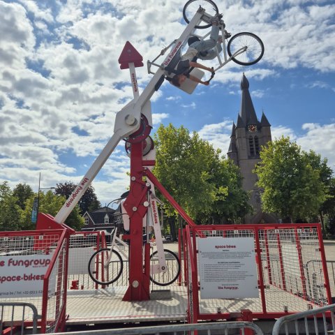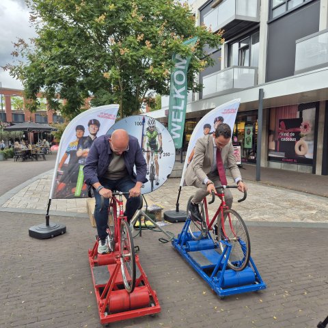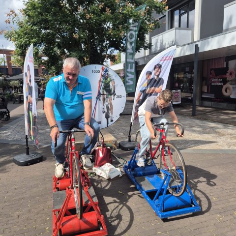 De rest van de middag was er volop te doen. Kinderen konden hun eigen schilderij fietsen en daarna ophalen op de Corridor. Een gezellige drukte! De sportievelingen namen het tegen elkaar op bij de competitiefietsen. Zo ook Gerard Achten van VVN-afdeling Valkenswaard en kinderburgemeester Jur Roothans. Jur bewees zijn lef door ook nog in de Over-de-Kop-fiets op de Markt te gaan. Bij VVN-afdeling Valkenswaard konden voorbijgangers terecht voor een gratis fietscontrole en advies.